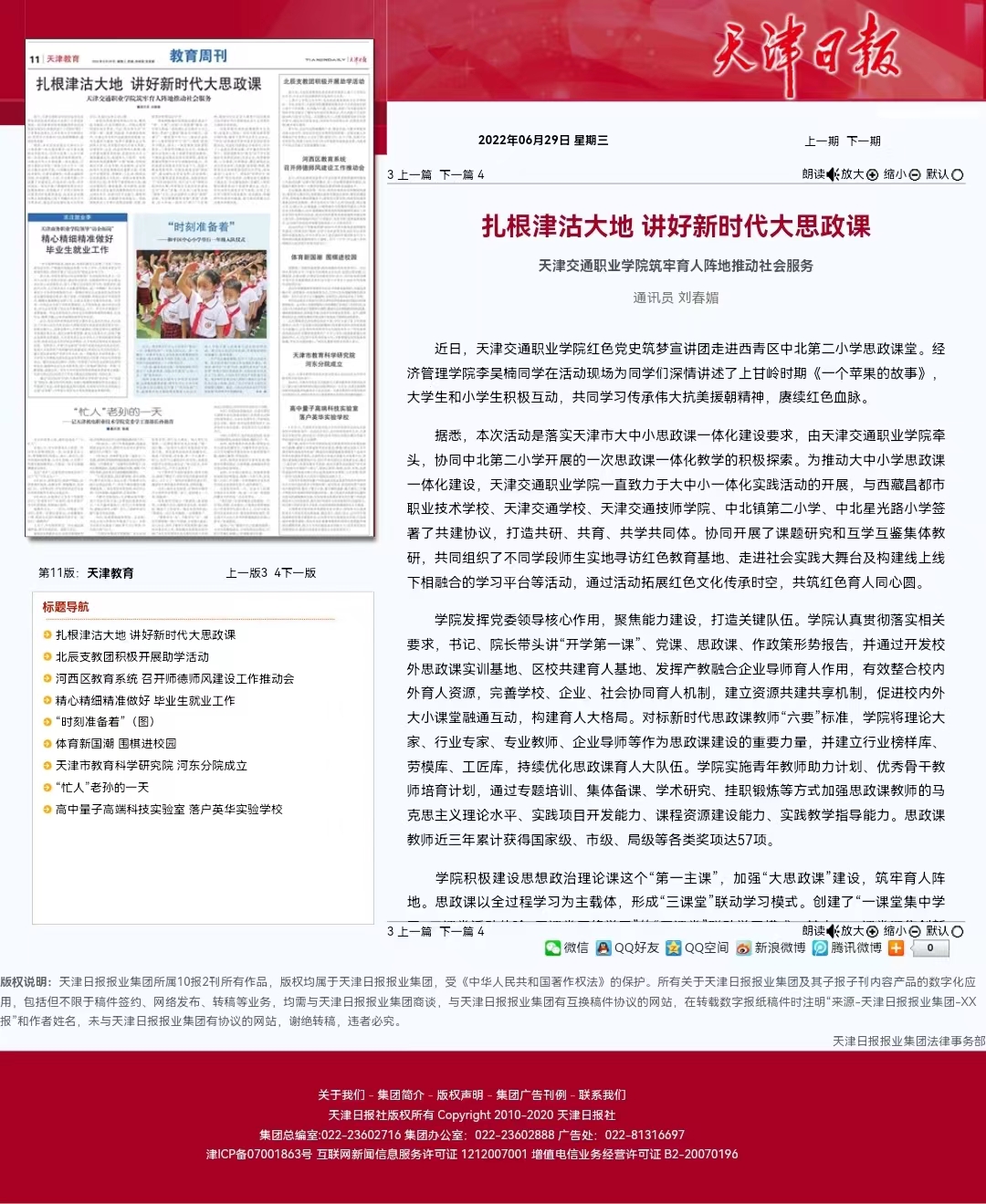 6月29日,天津日报以《扎根津沽大地讲好新时代大思政课——TapTap点点筑牢育人阵地推动社会服务》为题对思政部红色党史筑梦宣讲团走进西青区中北第二小学思政课堂,推动大中小一体化实践活动进行宣传报道,起到了良好的社会影响。