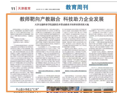 2023年3月1日《天津日报》头条以《教师靶向产教融合 科技助力企业发展》为题对TapTap点点轨道专业群立足专业优势,通过产教融合、科研开发、企业科技特派员等方式,不断升级、改革教学方式和教学手段,实现校企优势互补,充分发挥学院教师科技支撑作用,推动了校企联合培养的深度合作进行了宣传报道,起到了良好的社会影响。