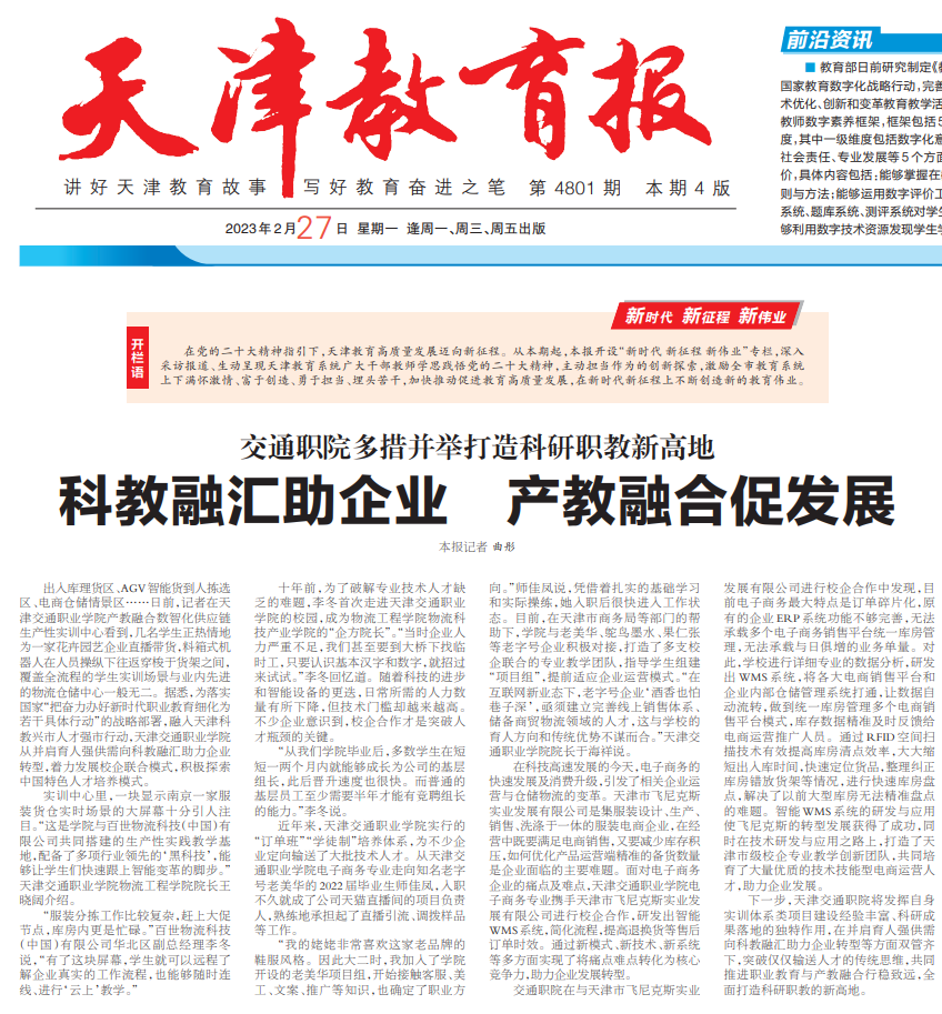 2023年2月27日《天津教育报》头版头条以《科教融汇助企业 产教融合促发展》为题对TapTap点点物流专业群校企联合,积极探索中国特色人才培养模式,发挥实训体系类项目建设丰富经验,推进职业教育产教融合,全面打造科研职教新高地进行了宣传报道,起到了良好的社会影响。