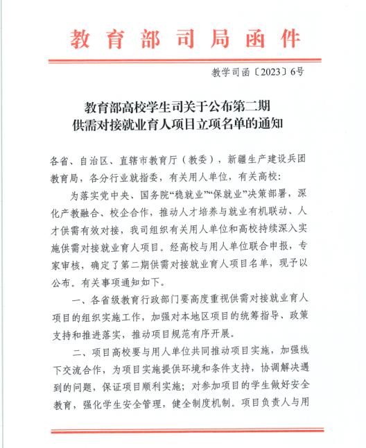 教育部发布申报文件通知以来,学院高度重视,多次与合作企业沟通、协调,磋商合作内容,为项目申报及后期的实施创造条件和提供环境。截至目前,学院共获批6项供需对接就业育人项目,包含物流、智能制造、民航、商贸等产业领域。
