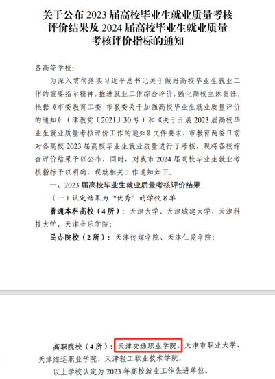 近日,天津市教育委员会下发《关于公布2023届高校毕业生就业质量考核评价结果及2024届高校毕业生就业质量考核评价指标的通知》,我校以优异的成绩被认定为“2023年高校就业工作先进单位”。并在“天津市2024届高校毕业生就业工作会议”中作为高职院校代表进行交流发言。