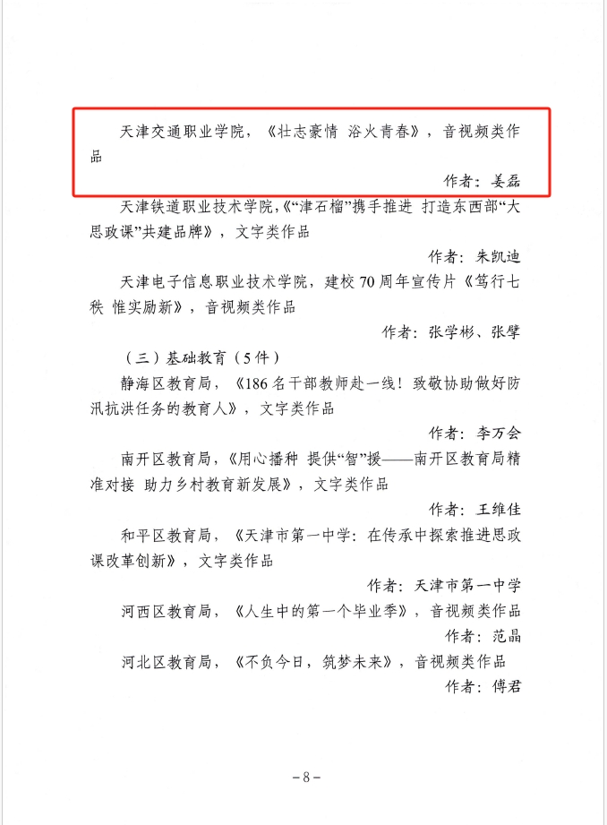 为深入学习宣传贯彻习近平文化思想、习近平总书记视察天津重要讲话精神,进一步加强教育新闻舆论工作,市教育两委组织开展了2023年度天津市“十大教育新闻作品”评选活动。经自主申报、专家评审、网上公示,学院《全国智能供应链行业产教融合共同体在津成立》《壮志豪情浴火青春》两部作品成功获评天津市“十大教育新闻作品”。