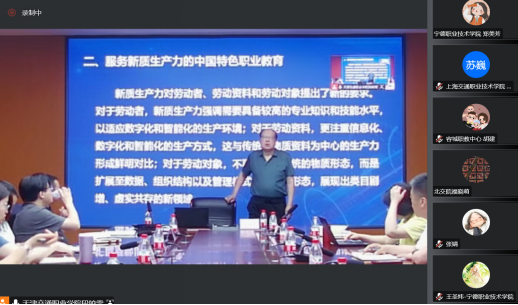 章建新教授以“职业教育服务新质生产力的着力点”为题,围绕“什么是新质生产力”“为什么要发展新质生产力”“职业教育如何赋能新质生产力”等基本问题,逐一阐释了新质生产力的形势背景、内涵特点以及赋能新质生产力的主要路径。针对当今社会制约高质量发展的主要因素,他指出新质生产力是推动高质量发展的内在要求和重要着力点,职业教育要主动做好“创新”“高质量”这篇大文章,推动新质生产力加快发展。针对职业教育在专业、课程、教材、教师、基地等关键办学领域提出对策建议,指出在培养新型劳动者队伍、应用更高技术含量的劳动资料、拓展更广范围的劳动对象方面大有可为,注重创新推动新质生产力三要素的提升和协同匹配,畅通教育、科技、人才的良性循环。
