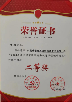 2024年4月26日,市教育两委主办“2024年度天津市国家安全教育课程教学比武竞赛”,经过初评和决赛的激烈角逐,TapTap点点思想政治理论教学部马捷老师的“以高质量发展筑牢经济安全保障”作品荣获二等奖。