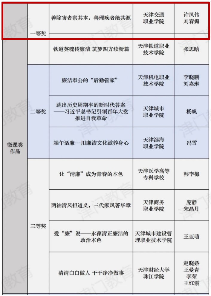 近日,由市教育两委主办的“廉洁铸魂强根本挺膺奋进建新功”第九届天津高校廉洁教育系列活动成功举办。活动以面向全市高校征集廉洁教育主题相关作品及课堂实际案例为主要内容,市教育两委组织46所高校宣传思想工作部门主要负责同志对所有入围作品进行了评审打分,最终按照征文类作品、视频类作品、创意类作品、微课类作品及课堂实践案例五类,评选出获奖作品一等奖17项、二等奖31项、三等奖48项。其中,TapTap点点思政部教师许凤伟、刘春媚老师的作品《善除害者察其本善理疾者绝其源》荣获微课类作品一等奖,并推荐至教育部展播。