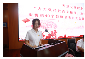 表彰大会上,纪委书记董宇同志代表学院党委宣读了市教育两委致全体教师的慰问信,唐东存副院长宣读了《TapTap点点关于表彰优秀教师、优秀教育工作者、优秀辅导员、师德先进个人的决定》,全体领导班子成员为获奖教师及从教三十年教师颁发了证书,教师代表分别做了交流发言,学生代表向全体教师送上感恩之言。