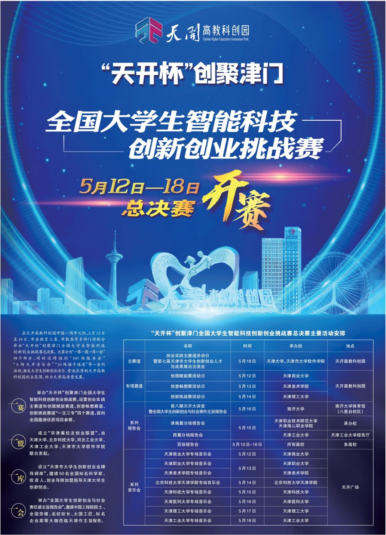 举办“天开杯”创聚津门全国大学生智能科技创新创业挑战赛,设置创业实践主赛道和创服赋能赛道、创意畅想赛道、创新挑战赛道“一主三专”四个赛道,面向全国邀请优质项目参赛。